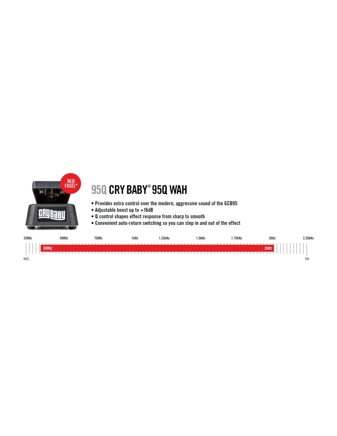 - Diseño Q Control: Ajusta el rango de barrido de frecuencia para obtener el wah perfecto para cualquier estilo musical. Desde un toque suave hasta un efecto agresivo, el Dunlop 95Q Crybaby Wah responde a tus necesidades.