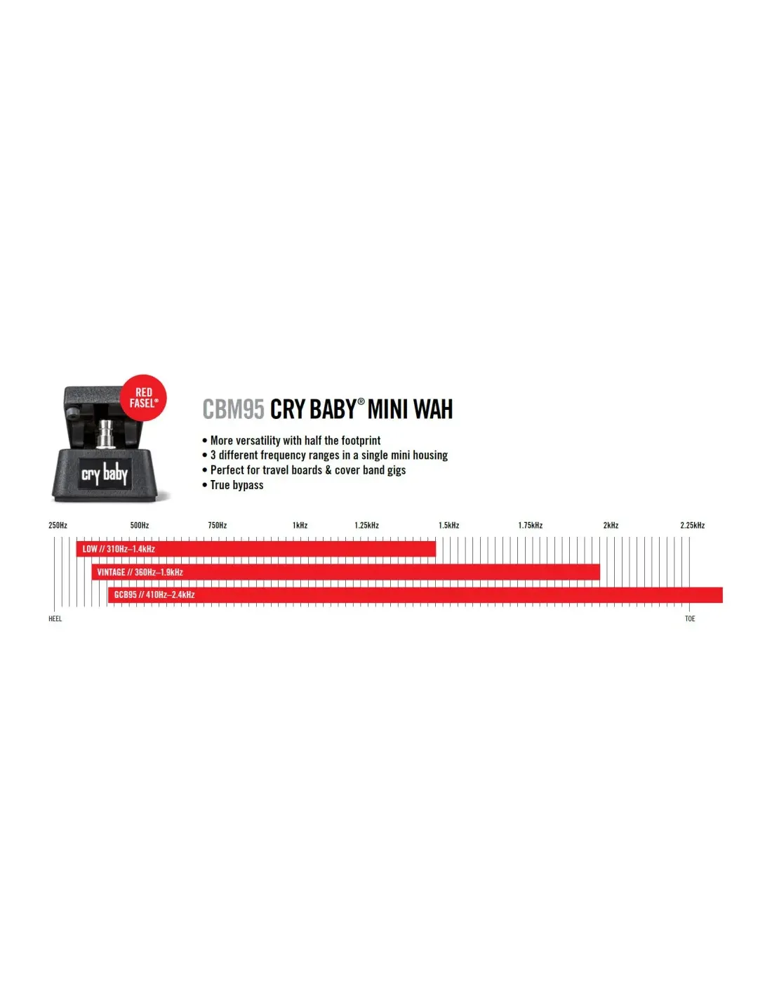 - 3 Modos de Voz: Equipa tres configuraciones internas (Low, Vintage y GCB95) que te permiten personalizar el tono de tu wah, desde un barrido vintage y clásico hasta uno más moderno y agresivo.